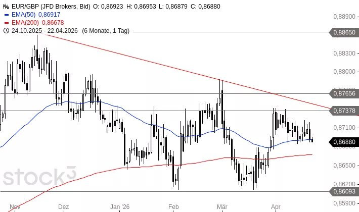 EUR/GBP pendelt seit Tagen am EMA50 (Tagesbasis) seitwärts. Aktuell droht ein Rückfall unter diesen. Sollte sich dieser Rückfall stabilisieren, dann müsste mit Abgaben in Richtung 0,8609 GBP gerechnet werden. Sollte EUR/GBP diesen EMA aber doch noch halten können und über 0,8738 GBP ausbrechen, dann wäre eine Aufwärtsbewegung gen 0,8865 GBP möglich.