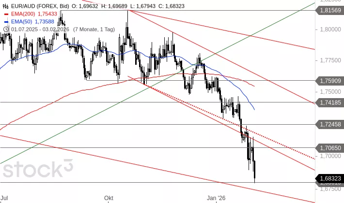 EUR/AUD befindet sich seit dem Scheitern am Widerstand bei 1,8157 AUD vom 17. Oktober in einer Abwärtsbewegung und hat zuletzt mögliche untere Begrenzungen durchbrochen. Auch die wichtige Unterstützung bei 1,7065 AUD wurde inzwischen aufgegeben. Allerdings sitzt EUR/AUD schon wieder auf dem nächsten Unterstützungsbereich um 1,6802 bis 1,6745 AUD auf. Von diesem Bereich aus könnte es zu einer mehrtägigen Erholung in Richtung 1,7065 AUD kommen.