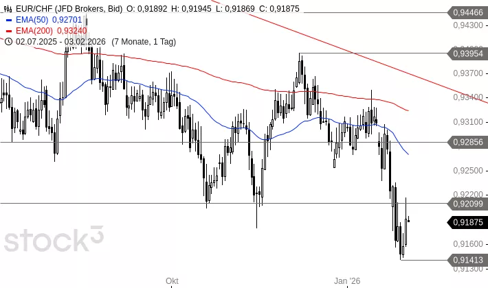 EUR/CHF erholte sich ausgehend vom Tief bei 0,9141 CHF deutlich und kletterte gestern an die alte untere Begrenzung einer Seitwärtsbewegung bei 0,9210 CHF. In dieser Seitwärtsbewegung hatte sich das Währungspaar seit August 2024 aufgehalten. Gestern prallte EUR/CHF bereits leicht daran ab. Daher könnte es zu einer erneuten Verkaufswelle kommen. Ein mögliches Ziel läge bei 0,8921 CHF. Erst eine stabile Rückkehr über 0,9210 CHF würde das Chartbild wieder aufhellen.