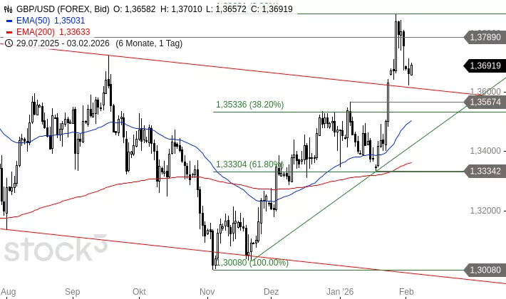 GBP/USD fiel in den letzten Tagen wieder zurück. Dieser Rückfall kann aber als Pullback an den gebrochenen Abwärtstrend ab Juli 2025 angesehen werden. Gestern stabilisierte sich GBP/USD knapp oberhalb dieses Trends, der heute bei 1,3615 GBP liegt. Das Währungspaar könnte somit einen neuen Anlauf zu einer Rally in Richtung des langfristig sehr wichtigen Widerstandsbereich um 1,4241 bis 1,4377 USD nehmen. Sollte der Rallyversuch aber nicht durchdringen, dann müsste mit Abgaben bis 1,3534 oder sogar 1,3330 USD gerechnet werden.