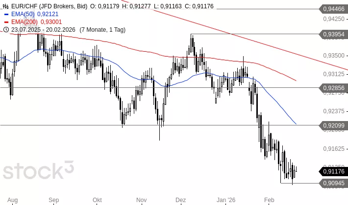 EUR/CHF brach am 27. Januar aus einer mehrmonatigen Seitwärtsbewegung nach unten aus und fiel inzwischen auf 0,9095 CHF zurück. Am Mittwoch notierte EUR/CHF kurzzeitig unter diesem Tief, erholte sich danach aber schnell wieder. Die Abwärtsbewegung ist trotzdem intakt und kann noch einige Zeit andauern. Ein Rückfall in Richtung 0,8779 CHF ist möglich. Ein neues, mittelfristiges Kaufsignal ergäbe sich frühestens bei einer Rückkehr über 0,9010 CHF.