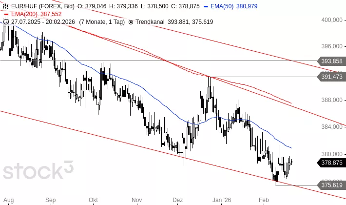 EUR/HUF befindet sich seit über einem Jahr in einer Abwärtsbewegung und setzte am 09. Februar auf der unteren Begrenzung dieser Bewegung auf. Seit einem Tief bei 375,619 HUF kommt es zu einem kleinen Stabilisierungsversuch. Bricht EUR/HUF über den Widerstandsbereich um den EMA50 bei aktuell 380,975 HUF nach oben aus, ist eine Erholung in Richtung 386 bis 387 HUF möglich. Sollte EUR/HUF unter 375,619 HUF abfallen, müsste mit weiteren Abgaben in Richtung 365,999 HUF gerechnet werden.