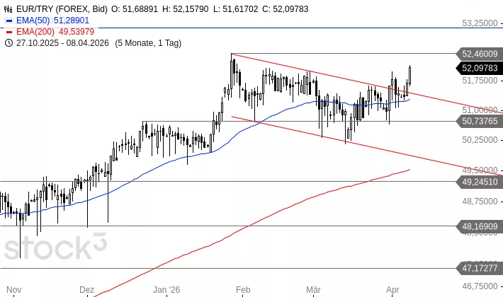 EUR/TRY drückte in den letzten Tagen gegen die Oberkante einer bullischen Flagge, die sich seit dem Allzeithoch vom 27. Januar 2026 entwickelt hatte. Seit gestern zieht das Währungspaar dynamisch aus dieser Flagge nach oben heraus. Damit besteht die Chance auf eine weitere Rally. EUR/TRY kann jetzt an ein noch offenes Ziel bei 53,1281 TRY ansteigen. Ein Rückfall unter den EMA50 bei 51,2893 TRY würde aber nicht in dieses Szenario passen.