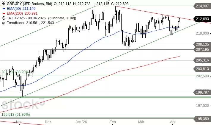 GBP/JPY befindet sich seit dem Mehrjahreshoch vom 04. Februar 2026 bei 214,997 JPY in einer Konsolidierung. Nach einem Test des Aufwärtstrends seit April 2025 zieht GBP/JPY seit einigen Tagen wieder an und erreicht aktuell den Abwärtstrend seit dem Mehrjahreshoch. Gelingt ein stabiler Ausbruch über diesen Trend, ist eine weitere Rally in Richtung 214,997 und ca. 220 JPY möglich. Sollte GBP/JPY aber unter 209,604 JPY abfallen, müsste mit Abgaben in Richtung 207,195 und möglicherweise sogar 202,736 JPY gerechnet werden.