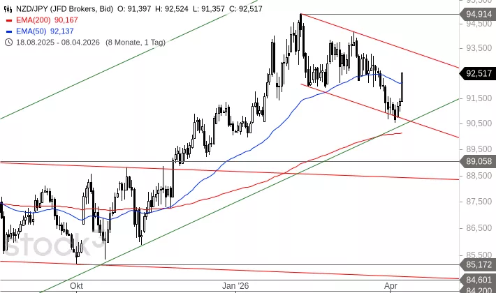 NZD/JPY konsolidiert seit dem Jahreshoch vom 09. Februar 2026 bei 94,914 JPY in einer bullischen Flagge. In den letzten Tagen bildete das Währungspaar an der Unterkante der Flagge einen kleinen Boden aus, den es heute vollendet. Gelingt jetzt auch noch ein Ausbruch aus der Flagge, dann ist der Weg für eine weitere Rally in Richtung 99,013 JPY geebnet. Die Oberkante der Flagge liegt heute bei 93,511 JPY.