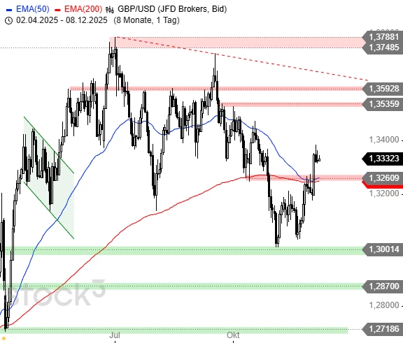 Mit dem dynamischen Rallyschub am Mittwoch hat das Britische Pfund gegenüber dem US-Dollar ein Kaufsignal ausgelöst, die Rückkehr über die beiden EMAs hat das kurzfristige Chartbild wieder entscheidend aufgehellt. Weiter steigende Notierungen wären damit denkbar, wobei auch Korrekturen bis 1,3240 - 1,3275 USD vorher noch eingeplant werden müssten. Die Chancen auf eine größere Aufwärtsbewegung bei GBP/USD sind deutlich gestiegen.