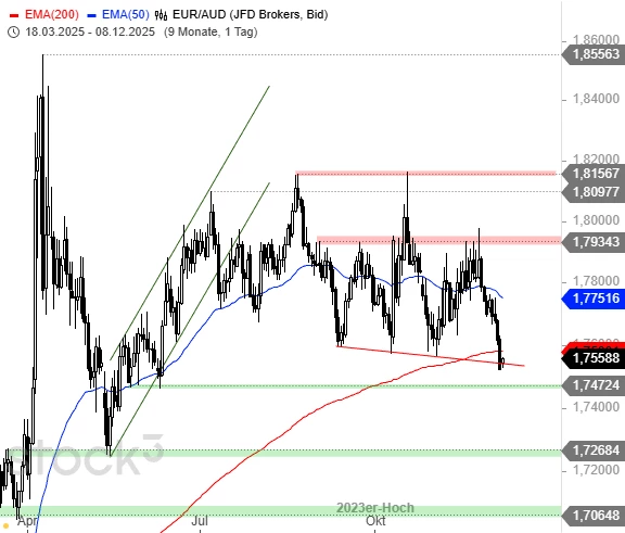 Innerhalb der mehrmonatigen Seitwärtsbewegung kam es in der vergangenen Woche zu einer schwungvollen Abwärtswelle. Dabei wurden der EMA200 und die flach fallende Pullbacklinie unterhalb der Tiefs seit September unterschritten, Letztere wird mit der heutigen Erholung verteidigt. Bleibt es beim Muster der letzten Monate, ist nun eine Erholung angesagt. Ob die Unterkante der Seitwärtsrange aber ein weiteres Mal verteidigt werden kann, ist offen. Unterhalb von 1,7470 AUD wird es kritischer.