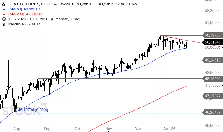 EUR/TRY befindet sich seit dem Allzeithoch vom 23. Dezember bei 50,7377 TRY in einer Konsolidierung. Dabei hält bisher der EMA50 (Tagesbasis). Aktuell nähert sich das Währungspaar dem kurzfristigen Abwärtstrend mit einer langen weißen Kerze an. Gelingt ein Ausbruch aus der Konsolidierung, dann kann die Rally in Richtung 53,1281 TRY fortgesetzt werden. Ein Tagesschlusskurs unter dem EMA würde hingegen auf eine Fortsetzung der Konsolidierung in Richtung 49,2451 TRY hindeuten.