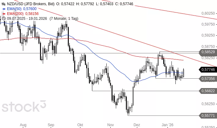 NZD/USD läuft seit einigen Tagen an der Unterstützung bei 0,5736 USD seitwärts. Heute versucht sich das Währungspaar erneut von dieser Unterstützung zu lösen. Damit bietet sich die Chance auf einen Anstieg bis 0,5853 USD. Sollte es aber doch noch zu einem stabilen Rückfall unter 0,5736 NZD kommen, dann wären weitere Abgaben bis 0,5682 und 0,5577 NZD möglich.