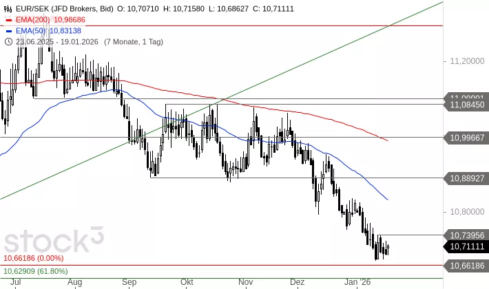 EUR/SEK versucht sich seit einigen Tagen am Tief aus dem April 2025 bei 10,6619 SEK zu stabilisieren. Gelingt diese Stabilisierung, ist eine Erholung in Richtung des EMA50 (Tagesbasis) bei 10,8314 SEK möglich. Sollte diese Stabilisierung aber scheitern, dann würden Abgaben in Richtung 10,4650 bis 10,4600 SEK drohen.