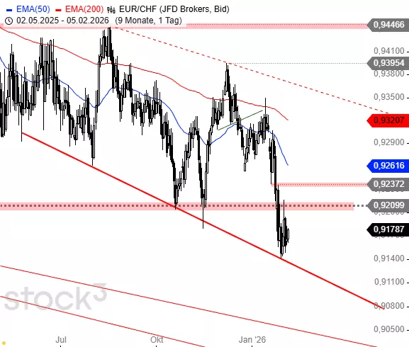 Gegenüber dem Schweizer Franken erzeugte der Euro zuletzt ein größeres Signal für die Bären, nachdem der zentrale Support um 0,92 CHF nachhaltig nach unten hin durchbrochen wurde. Dieses Signal wurde mit einer Erholung an das Ausbruchslevel bestätigt, EUR/CHF kippt wieder zurück. Das Währungspaar wäre damit anfällig für eine weitere Abwertung, wobei die fallende Unterstützungslinie noch Halt bieten könnte. Erneute Erholungen bis 0,9200 - 0,9217 CHF wären jederzeit möglich, ein bullisches Signal würde erst oberhalb von 0,9240 CHF entstehen.