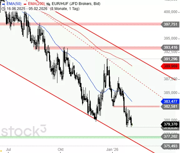 Innerhalb des übergeordneten Abwärtstrends versucht der Euro gegenüber dem Ungarischen Forint gerade eine Stabilisierung auf tiefem Niveau. Die Kursmuster sind bislang aber wenig konstruktiv und sprechen eher für eine Fortsetzung der Abwärtsbewegung. Für bullische Signale müsste die Hürde bei 382 - 383 HUF nachhaltig überwunden werden. Eine Erholung zum EMA200 und ggf. zur Oberkante des übergeordneten Abwärtstrendkanals wäre dann drin.