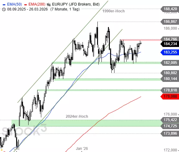 In der vergangenen Woche löste sich der Euro gegenüber dem Japanischen Yen vom Unterstützungsbereich bei 182 JPY und zog nach oben. Jetzt steht das Währungspaar am Zwischenhoch von Ende Februar. Dieses bildet den Trigger für die Bullen. Zwischenkorrekturen wären hier kurzfristig möglich, ein signifikanter Ausbruch über 184,77 JPY würde schließlich einen neuen Anlauf auf das Jahreshoch ermöglichen.