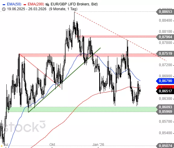 Nach dem Kursrutsch der ersten Märzhälfte erholt sich der Euro gegenüber dem Britischen Pfund ausgehend vom Jahrestief aus dem Februar. Diese Erholung trifft am EMA50 bereits auf ersten Widerstand. Eine Rückkehr über diese gleitende Durchschnittslinie könnte eine weitere Erholung einleiten. Solange aber kein Anstieg darüber erfolgt, bleibt EUR/GBP anfällig für weitere Tests des zentralen Supports bei 0,8597 - 0,8612 GBP. Dessen Bruch würde größere Verkaufssignale bringen.
