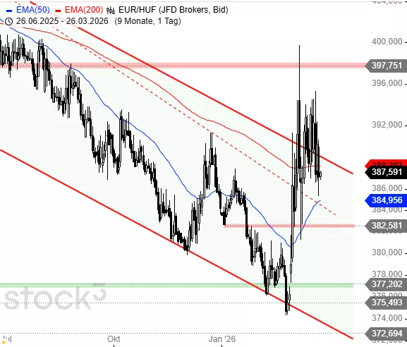 Mit einem massiven bullischen Reversal Anfang März beendete der Euro gegenüber dem Ungarischen Forint den mittelfristigen Abwärtstrend und erholte sich dynamisch. Diese Rally wird korrigiert, die Volatilität bleibt hoch. Die beiden EMAs könnten jetzt stützen, ausgehend von diesen wären weitere Erholungswellen denkbar. Unterhalb von 381 HUF wird es hingegen kritischer, der Abwärtstrend könnte dann wieder aufgenommen werden.