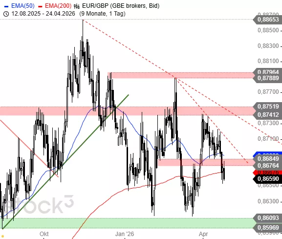 Zuletzt versuchte der Euro gegenüber dem Britischen Pfund eine Stabilisierung oberhalb des EMA50, mit dem Rückfall darunter trübt sich die Situation kurzfristig wieder ein. Innerhalb der übergeordnet trendlosen Marktphase wäre EUR/GBP damit wieder anfällig für weitere Kursrücksetzer. Der zentrale Support im Big Picture liegt bei 0,8597 - 0,8612 GBP. Erst bei einer erneuten Rückkehr über die gleitende Durchschnittslinie EMA50 wären die Bullen wieder im Vorteil.