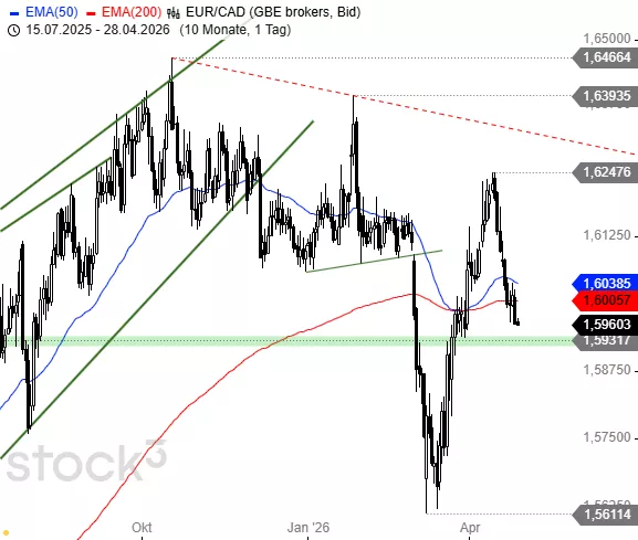 Die steile Rally von Mitte März bis Mitte April wird beim Euro gegenüber dem Kanadischen Dollar scharf korrigiert. Steil geht es nach unten, EUR/CAD unterbietet die beiden EMAs wieder. Rund um 1,5932 CAD liegt ein markanter Unterstützungsbereich, der noch erreicht werden könnte. Von dort aus wären neue Erholungsansätze denkbar. Für bullische Impulse müsste eine Rückkehr über 1,6040 CAD gelingen.