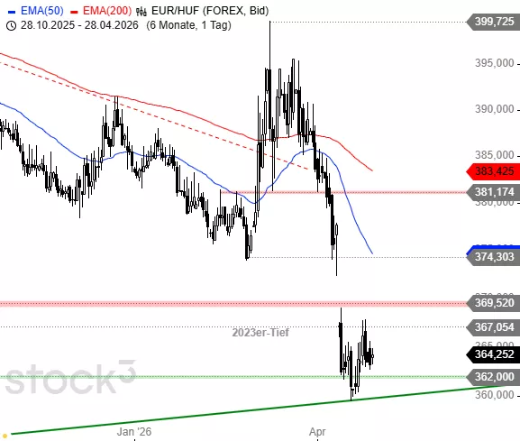 Nach dem Crash in der ersten Aprilhälfte versucht der Euro jetzt eine Stabilisierung gegenüber dem Ungarischen Forint. Ob daraus eine Bodenbildung entstehen kann, ist derzeit noch offen. Bei einem Anstieg über die Zwischenhochs der vergangenen Woche sowie über 370 HUF steigen die Chancen der Bullen deutlich, dann könnte es zu einer Erholung zum EMA50 kommen. Mit neuen Jahrestiefs hingegen könnten größere Verkaufssignale entstehen.