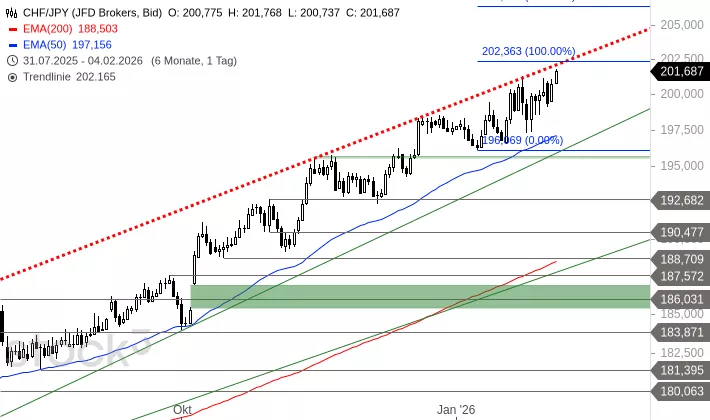 CHF/JPY befindet sich seit fast einem Jahr in einer starken Rally. Seit Juli 2025 begrenzt eine obere Pullbacklinie die Ambitionen der Bullen. Diese liegt heute bei 202,17 CHF und damit fast auf dem Niveau eines noch offenen Ziels bei 202,36 JPY. Das Währungspaar notiert nahe an diesem Bereich. CHF/JPY könnte nach Erreichen dieses Ziels zu einer größeren Konsolidierung in Richtung 195,71 JPY ansetzen. Gelingt allerdings ein Ausbruchüber diesen Bereich, dann ist eine weitere Rally gen 206,35 JPY möglich.