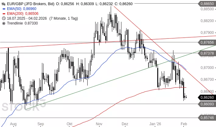 EUR/GBP befindet sich seit dem Hoch vom 14. November 2025 bei 0,8865 CHF in einer Abwärtsbewegung. Dabei bot zunächst der EMA200 Halt. Aber vorgestern durchbrach das Währungspaar diese Unterstützung. Damit deutet sich die Fortsetzung der Abwärtsbewegung in Richtung 0,8507 GBP an. Eine Rückkehr über den EMA200 bei aktuell 0,8651 GBP würde das Chartbild aber wieder stabilisieren.
