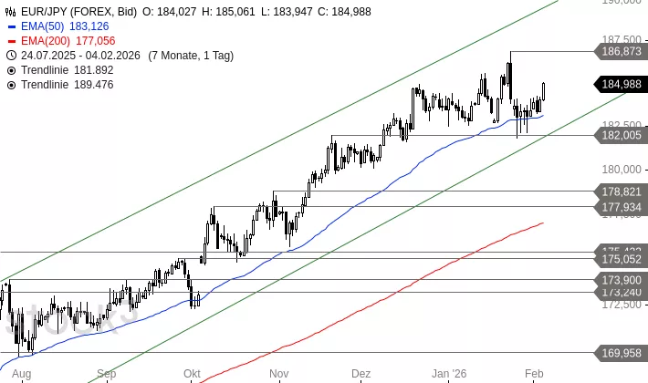 EUR/JPY musste nach dem Hoch vom 23. Januar bei 186,873 JPY eine tiefe Konsolidierung hinnehmen und fiel auf das Zwischenhoch vom 20. November bei 182,005 JPY zurück. Dort fing sich das Währungspaar wieder und zieht seit einigen Tagen an. Damit könnte sich das Währungspaar in einer weiteren Aufwärtswelle in Richtung der oberen Begrenzung der Rally seit Februar 2025 bei aktuell 189,476 JPY befinden. Ein Rückfall unter 182,005 JPY würde aber auf Abgaben in Richtung 178,821 bis 177,934 JPY hindeuten.