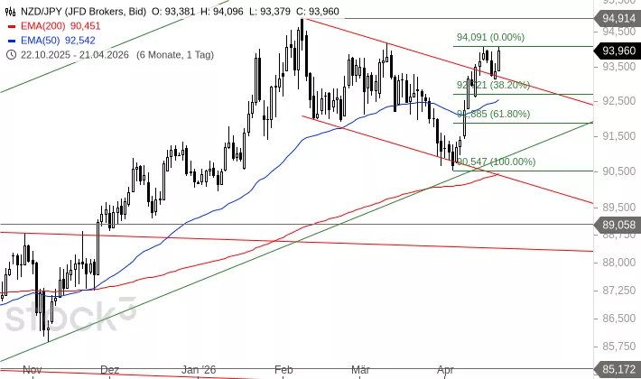 NZD/JPY brach am 13. April 2026 aus einer bullischen Flagge nach oben aus. Nach einem kleinen Rücksetzer an diese Flagge in den letzten Tagen zieht das Währungspaar heute Nacht deutlich an und löst sich mit einer langen weißen Kerze von der Flaggenoberkante. Damit besteht eine gute Chance auf eine weitere Rally in Richtung 94,914 JPY und 99,013 JPY. Sollte NZD/JPY aber unter 92,721 JPY abfallen, würde sich das Chartbild kurzfristig eintrüben.