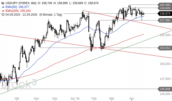 USD/JPY attackierte Ende März das Hoch bei 159,899 JPY, konnte sich aber nicht darüber etablieren und fiel wieder auf die Unterstützung bei 157,66 JPY zurück. Dort fing sich das Währungspaar wieder. Damit notiert USD/JPY weiterhin oberhalb des gebrochenen Abwärtstrends seit dem Hoch aus dem Jahr 2024 und hat noch immer Chancen auf einen Anstieg bis an dieses Hoch bei 161,949 JPY.
