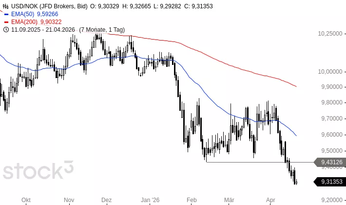 USD/NOK durchbrach am 15. April die Unterstützung bei 9,4113 NOK und bestätigte damit die Abwärtsbewegung seit Januar 2025. Diese Abwärtsbewegung kann in den nächsten Tagen zu einem Test des langfristigen Aufwärtstrends seit März 2018 bei aktuell 8,8824 NOK führen. Erst eine Rückkehr über 9,4113 NOK würde das Chartbild wieder stabilisieren.