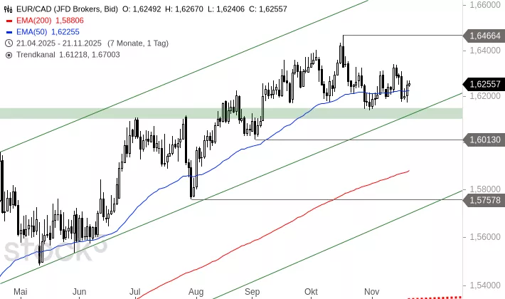 EUR/CAD befindet sich seit dem Jahreshoch bei 1,6466 CAD in einer Konsolidierung. Dabei fiel das Währungspaar in dieser Woche erneut bis fast auf die wichtige Unterstützungszone zwischen 1,6152 und 1,6105 CAD zurück. Gestern kam an dieser Zone wieder leichtes Kaufinteresse auf. EUR/CAD hat damit die Chance, eine Rally einzuleiten, die zu einem Anstieg in Richtung 1,6969 CAD und an das Allzeithoch bei 1,7513 CAD führen könnte. Ein Rückfall unter 1,6105 CAD wäre aber ein deutlicher Rückschlag für die Bullen.