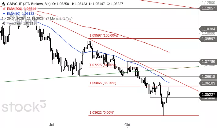 GBP/CHF befindet sich seit dem Tief bei 1,0362 CHF vom 14. November in einer Erholung. Diese Erholung führte das Währungspaar gestern fast an ein kurzfristig log 38,2%-Retracement bei 1,0587 USD und damit nahe an das Tief aus dem April 2025 bei 1,0610 CHF. In diesem Bereich könnte die Erholung der letzten Tage jederzeit enden. Ein Rückfall in Richtung 1,0160 CHF könnte folgen. Erst ein Ausbruch über 1,0728 CHF würde das Chartbild wieder deutlicher aufhellen.