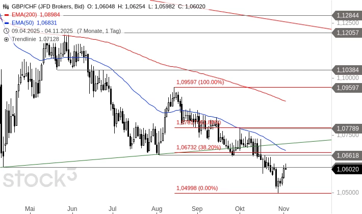 GBP/CHF fiel am 29. Oktober auf ein Tief bei 1,0500 CHF und damit auf den tiefsten Stand seit 28. September 2022 zurück. Seit diesem Tief erholt sich das Währungspaar. Diese Erholung ist bisher ein Pullback an den gebrochenen Aufwärtstrend ab September 2022. Diese Erholung kann nach dem Erreichen des Widerstands bei 1,0610 CHF jederzeit abbrechen. Aber auch ein Anstieg bis in den Bereich um 1,0662 bis 1,0673 CHF wäre noch möglich. Mittelfristig muss mit einem Abverkauf in Richtung 1,0160 CHF gerechnet werden.