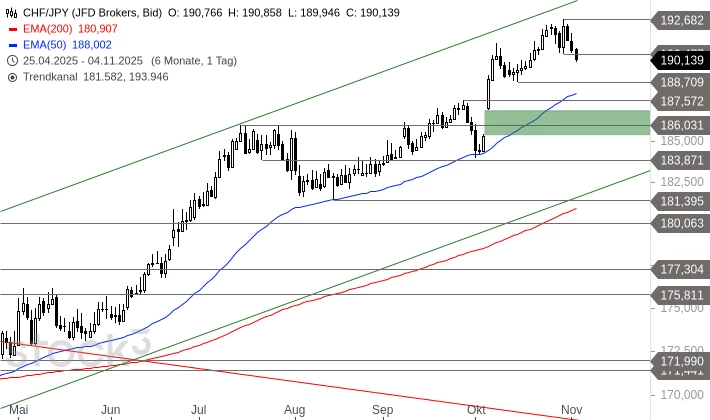 CHF/JPY befindet sich seit Ende Februar 2025 in einer starken Rally. Dabei kletterte das Währungspaar auf ein Hoch bei 192,682 JPY. Seit drei Tagen fällt es aber zurück und durchbricht heute die kleine Unterstützung bei 190,477 JPY. Damit deutet sich ein Verkaufssignal in Richtung 187,572 oder sogar 185,465 JPY an. Eine dynamische Rückkehr über 190,477 JPY könnte allerdings einen Anstieg bis 192,682 oder sogar knapp über 194 JPY ermöglichen.