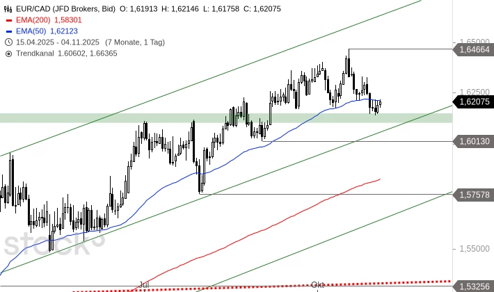 Nach dem Mehrjahreshoch bei 1,6466 CAD vom 17. Oktober 2025 setzte bei EUR/CAD eine Konsolidierung ein, die das Währungspaar auf die wichtige Zone um 1,6151 bis 1,6102 CAD zurückführte. Dort versucht sich das Währungspaar seit einigen Tagen zu stabilisieren. Dabei bremste zuletzt aber mehrfach der EMA50 (Tagesbasis) bei 1,6212 CAD. Ein Ausbruch darüber würde die Chance auf eine Wiederaufnahme der Rally in Richtung 1,6466 CAD, 1,6969 CAD und sogar an das Allzeithoch bei 1,7513 CAD ermöglichen.