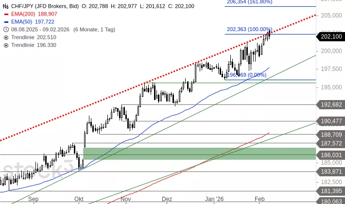 CHF/JPY erreichte am Freitag das Ziel bei 202,363 JPY und damit die Oberkante der Aufwärtsbewegung seit Februar 2025. Heute eröffnete das Währungspaar zwar darüber, aber im bisherigen Tagesverlauf fällt es wieder zurück. Daher könnte mit dem heutigen Tag der Startschuss für eine mehrtägige oder sogar mehrwöchige Konsolidierung in Richtung des Aufwärtstrends seit Februar 2025 bei aktuell 196,330 JPY fallen. Gelingt allerdings doch noch ein Ausbruch über 202,363 JPY, dann wäre eine direkte Rally in Richtung 206,354 JPY möglich.