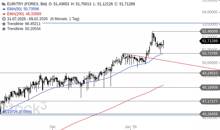 EUR/TRY setzte nach dem Hoch bei 52,4601 TRY vom 27. Januar 2026 auf das alte Allzeithoch bei 50,7377 TRY zurück. Dort fing sich das Währungspaar in den letzten Tagen wieder. Heute löst es sich von dieser Unterstützung. Daher ist eine kurzfristige Rallyfortsetzung in Richtung 53,1281 TRY möglich. Sollte EUR/TRY doch noch unter 50,7377 TRY abfallen, müsste mit Abgaben in Richtung 49,2451 TRY gerechnet werden.