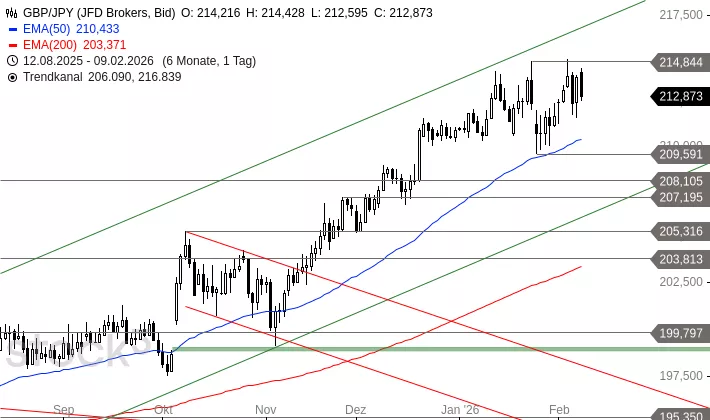 GBP/JPY erreichte am 23. Januar 2026 ein Hoch bei 214,844 JPY. Seit diesem Hoch befindet sich das Währungspaar in einer Konsolidierung zwischen diesem Hoch und einer Unterstützung bei 209,591 JPY. Bricht GBP/JPY nach oben aus, ist eine weitere Rally in Richtung 220,229 möglich. Ein Rückfall unter 209,591 würde aus der Seitwärtsbewegung ein Doppeltop machen. Das rechnerische Ziel läge dann bei 204,466 JPY.
