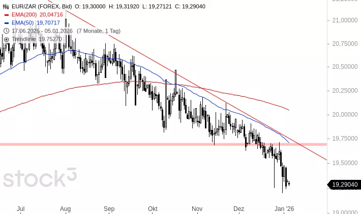 EUR/ZAR erreichte im April 2025 ein Hoch bei 22,1446 ZAR. Seit diesem Hoch befindet sich das Währungspaar in einer Abwärtsbewegung. Dabei kam es zuletzt zu einem Rückfall unter die Unterstützungszone um 19,7105 bis 19,6821 ZAR. Mit diesem Rückfall ergab sich weiteres Abwärtspotenzial bis 18,4943 ZAR und damit an das Tief aus dem Dezember 2025. Erst ein Ausbruch über 19,7105 ZAR würde Potenzial für eine größere Erholung eröffnen.