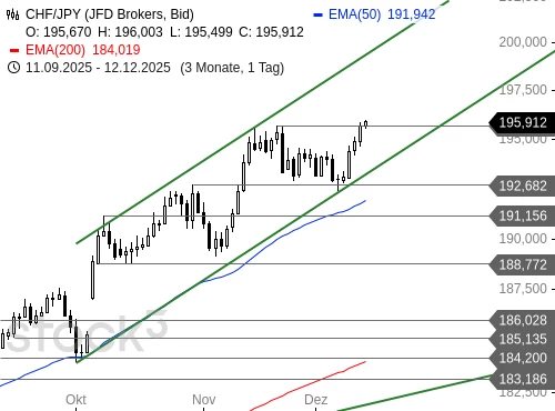 CHF/JPY legte in den vergangenen Tagen ausgehend vom Support bei 192,68 JPY deutlich zu und kletterte auf ein neues Verlaufshoch. Der Weg innerhalb des Trendkanals der vergangenen Wochen ist nun frei in Richtung 200 JPY. Ein Projektionsziel befindet sich bei 199 JPY. Unterstützungen liegen bei 194,58 JPY und vorrangig bei 192,68 JPY.