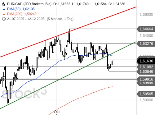 Nach einem deutlichen Abverkauf erholte sich EUR/CAD zuletzt, stößt nun aber auf Widerstände in Form ehemaliger Unterstützungen. Im Fokus steht die Hürde bei 1,6179 CAD. Erst eine überzeugende Rückeroberung dieser Marke würde die alte Range wiederherstellen. Größere Entspannung lässt sich sogar erst über 1,6328 CAD ableiten. Folgeverkaufssignale entstehen unter 1,6065 CAD.