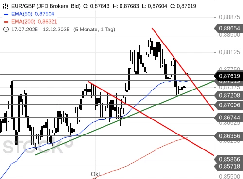 Die Konsolidierung seit September führte EUR/GBP wieder zurück an den maßgeblichen mittelfristigen Aufwärtstrend seit August. Dort prallte das Währungspaar nach oben ab. Die doppelte Barriere aus Abwärtstrend und horizontalem Widerstand stellt für die Bullen ein Hindernis dar. Darüber könnte die Erholung in Richtung 0,8800 GBP an Fahrt gewinnen. Auf der Unterseite bieten 0,8752 GBP Unterstützung. Unter 0,8720 GBP wäre ein Verkaufssignal aktiviert.