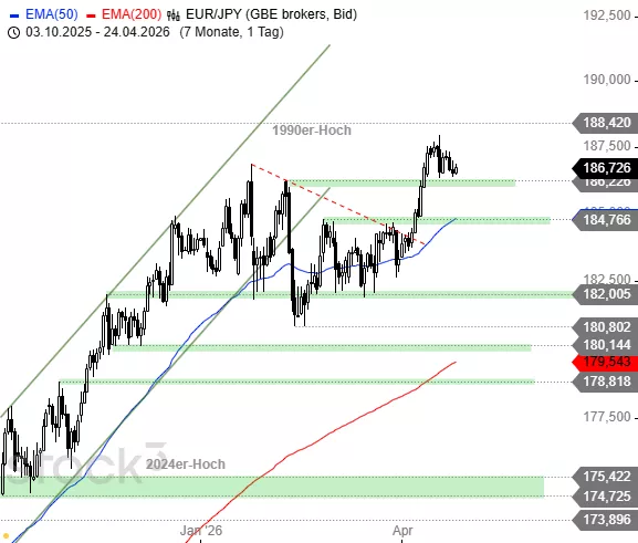 Gegenüber dem Japanischen Yen konsolidiert der Euro seit einigen Tagen auf hohem Niveau. Zuvor kam es Mitte April zu einer schwungvollen Rally und zum Ausbruch über die Jahreshochs. Das 1990er-Hoch als mögliche Barriere wäre das Idealziel der Aufwärtswelle und könnte in Kürze erreicht werden. Bis dahin hält EUR/JPY im besten Fall das hohe Niveau. Tiefe Pullbacks zum EMA50 wären aktuell nur das Alternativszenario.