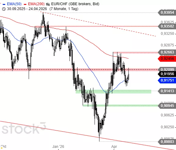 Der Euro hat gegenüber dem Schweizer Franken nach dem bullischen Reversal Ende März eine steile Kurserholung hingelegt. Diese Rallybewegung wird aktuell korrigiert, wobei sich EUR/CHF im Bereich des EMA50 stabilisiert. Von dort aus schnellt der Wert zum Wochenstart nach oben und erreicht wieder die Hürde bei 0,9210 CHF. Weitere Erholungen wären möglich, der EMA200 deckelt das Kursgeschehen auf der Oberseite. Geht es nachhaltig darüber, könnten weiter steigende Notierungen folgen.