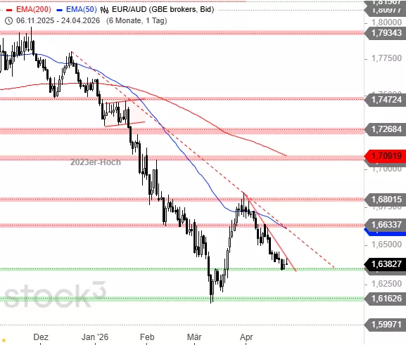 Deutlich unter Druck geriet in den vergangenen drei Wochen der Euro gegenüber dem Australischen Dollar. Machte die steile Rallybewegung der zweiten Märzhälfte noch Hoffnung auf eine Trendwende nach dem steilen Abwärtstrend der Wintermonate, so verpuffen die Chancen der Bullen mit dem tiefen Rücksetzer wieder. EUR/AUD notiert wieder nahe den Jahrestiefs, die beim Bruch der Unterstützung bei 1,6353 AUD auch erreicht werden könnten. Ein Anstieg über die Abwärtstrendlinie hingegen könnte eine Erholung zum EMA50 zulassen.
