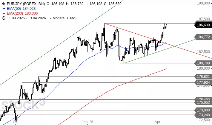 EUR/JPY brach am 07. April über den Widerstand bei 184,722 JPY nach oben aus und beendete damit eine mehrwöchige Konsolidierung. Am Freitag erreichte das Währungspaar das Jahreshoch bei 186,873 JPY. Heute startete EUR/JPY zwar etwas schwächer in den Handel, zieht aber intraday bereits wieder an. Ein Ausbruch auf ein neues Jahreshoch würde den Weg in Richtung 190 und später sogar 195 JPY ebnen. Solange dieser Ausbruch aber fehlt, muss kurzfristig ein Rücksetzer gen 184,772 JPY einkalkuliert werden.