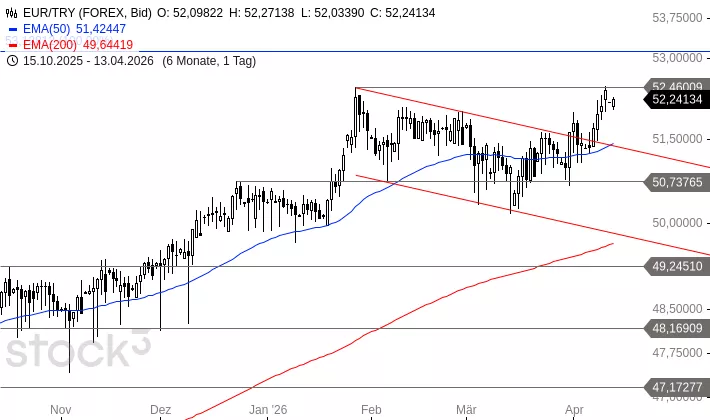 EUR/TRY erreichte am Freitag das Allzeithoch bei 52,4600 TRY und eröffnete heute leicht schwächer. Dieser Rückfall wird aber sofort wieder gekauft. Ein Ausbruch auf ein neues Allzeithoch würde den Weg bis zu einem noch offenen Ziel bei 53,1281 TRY endgültig ebnen. Später wären noch deutlich höhere Kurse möglich. Kurzfristige Rücksetzer gen 51,4255 TRY, also auf den EMA50, wären unproblematisch.