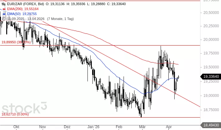 EUR/ZAR fiel am 27. Februar 2026 auf ein Tief bei 18,6271 ZAR zurück. Danach startete eine Rally bis an das logarithmische 38,2%-Retracement der Abwärtsbewegung seit 11. April 2025. Von dort aus setzte das Währungspaar auf den gebrochenen Abwärtstrend ab April 2025 zurück, wo es in der letzten Woche wieder nach oben drehte. EUR/ZAR kann jetzt in Richtung 19,8995 und 20,7287 ZAR ansteigen, außer es käme zu einem Rückfall unter das Tief aus der letzten Woche bei 18,9320 ZAR.