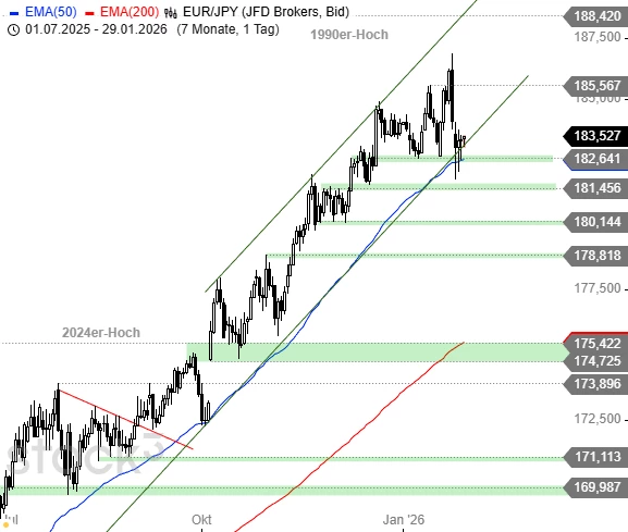 Nach dem heftigen Abverkauf ausgehend vom neuen Rallyhoch stabilisiert sich der Euro gegenüber dem Japanischen Yen jetzt im Bereich der Aufwärtstrendlinie und des EMA50. Ein hochvolatiler Bodenbildungsversuch dauert an, im Erfolgsfall winkt mit einem Anstieg über die Zwischenhochs der letzten beiden Tage ein neuer Anlauf auf die Jahreshochs. Kritischer wird es erst bei einem nachhaltigen Abtauchen unter 181,40 JPY.