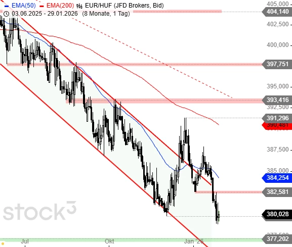 Nach der Erholung in der ersten Januarhälfte gerät der Euro gegenüber dem Ungarischen Forint wieder unter Druck und rutscht im Zuge des übergeordneten Abwärtstrends auf neue Tiefs zurück. Damit stehen die Zeichen auf Trendfortsetzung gen Süden. Die Widerstandsmarke bei 382,58 HUF gilt als kleiner Trigger auf der Oberseite, eine Rückkehr darüber würde eine Erholung ermöglichen.