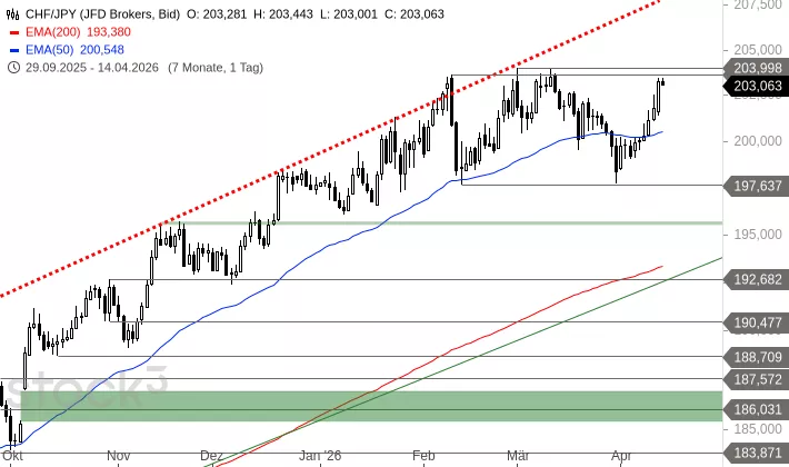 CHF/JPY startete im Februar 2025 zu einer starken Rally. Diese führte am 10. Februar zu einem Hoch bei 203,646 JPY. Seitdem befindet sich das Währungspaar trotz eines zwischenzeitlichen Anstiegs auf 203,998 JPY in einer Seitwärtsbewegung. Die untere Begrenzung liegt bei 197,637 JPY. Aktuell notiert das Währungspaar nahe an der oberen Begrenzung der Seitwärtsbewegung. Gelingt ein Ausbruch aus dieser Bewegung nach oben, dann ist eine weitere Rally in Richtung 210,564 JPY möglich. Ein Abpraller würde aber auf einen erneuten Rückfall gen 197,637 JPY hindeuten.