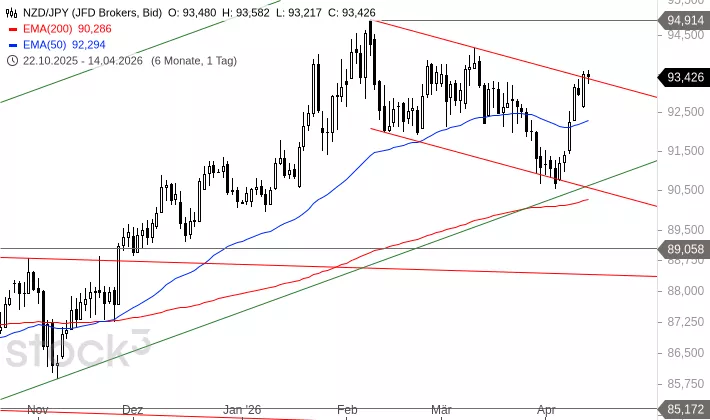 NZD/JPY korrigiert seit dem Jahreshoch vom 09. Februar 2026 bei 94,914 JPY in einer bullischen Flagge. Seit gestern läuft ein Ausbruchsversuch aus dieser Flagge. Gelingt er, dann kann das Währungspaar in Richtung des Hochs aus dem Jahr 2024 bei 99,013 JPY durchziehen. Sollte NZD/JPY aber unter das gestrige Tagestief bei 92,607 JPY abfallen, wäre der Ausbruchsversuch gescheitert und NZD/JPY könnte zunächst in Richtung 91,000 JPY abfallen.